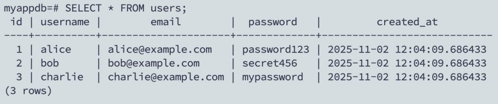 যা রিটার্ণ করবে INSERT 0 3। এবার ডেটা গুলো দেখতে চাইলেঃ