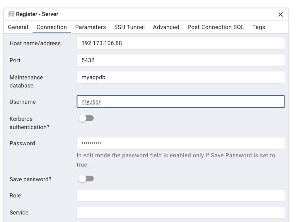 এখানে প্রথমে একটা নাম চাইবে। যে কোন একটা নাম দিতে পারব। Host name / address এ সার্ভারের আইপি এড্রেস দিতে হবে। কোন ডেটাবেজ কানেক্ট করব, তা লিখতে হবে Maintenance database ফিল্ডে। এরপর ডেটাবেজ ইউজারনেম এবং পাসওয়ার্ড দিয়ে সেভ করলে কানেক্ট করা যাবে। পোর্ট সাধারণত 5432 হয়ে থাকে। ম্যানুয়ালি পরিবর্তন না করলে 5432 ব্যবহার করতে হবে। এরপর ভিজ্যুয়ালি ডেটাবেজ ম্যানেজ করা যাবে।
